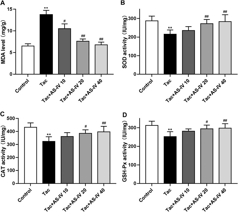 Figure 2. Astragaloside IV attenuates oxidative stress induced by tacrolimus in vivo (n = 8). Mice were treated with tacrolimus ± Astragaloside IV for 4 weeks, and then renal tissues were taken to evaluate the effects of Astragaloside IV on malondialdehyde (MDA) (A), superoxidase dismutase (SOD) (B), catalase (CAT) (C) and glutathione peroxidase (GSH-Px) (D) levels. **p < 0.01 vs. the Control group; #p < 0.05 and ##p < 0.01 vs. the Tac group.