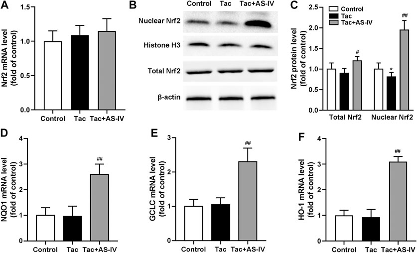 Figure 4. Astragaloside IV induced Nrf2 nuclear translocation and down-stream genes transcription in vivo. The mice were treated with tacrolimus ± Astragaloside IV for 4 weeks, and then renal tissues were taken to evaluate the effects of Astragaloside IV on the Nrf2 mRNA levels (n = 8) (A), the nuclear and total Nrf2 protein levels (n = 6) (B)–(C), the mRNA levels of NQO1 (D), GCLC (E) and HO-1 (F) (n = 8). *p < 0.05 vs. the Control group; #p < 0.05 and ##p < 0.01 vs. the Tac group.