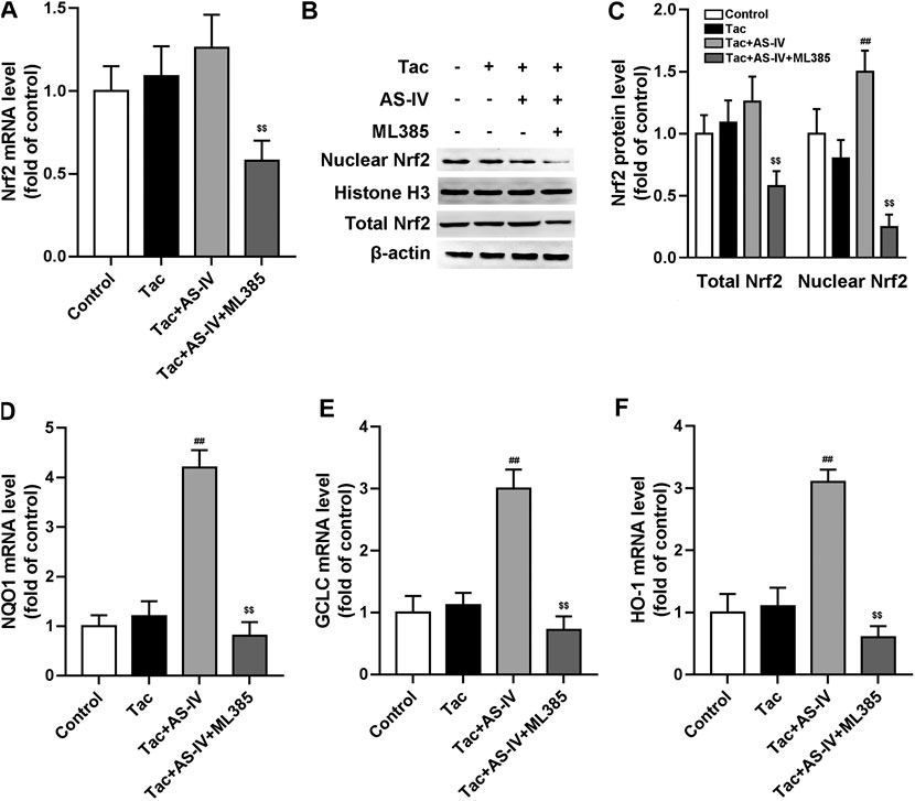 Figure 5. ML385 inhibited Astragaloside IV-induced Nrf2 nuclear translocation and down-stream genes transcription in HK-2 cells. The HK-2 cell were pretreated with AS-IV (50 µM) with or without ML385 (3 µM) for 30 min. Then tacrolimus was added into the cells for 24 h (A) The Nrf2 mRNA in HK-2 cells were tested by RT-qPCR assay (n = 8) (B–C) The nuclear Nrf2 and total Nrf2 protein of HK-2 cell were detected by Western blotting (n = 6). The mRNA levels of NQO1 (D), GCLC (E) and HO-1 (F) were evaluated by RT-qPCR (n = 8). ##p < 0.01 vs. the Tac group; $$p < 0.01 vs. the Tac + AS-IV group.