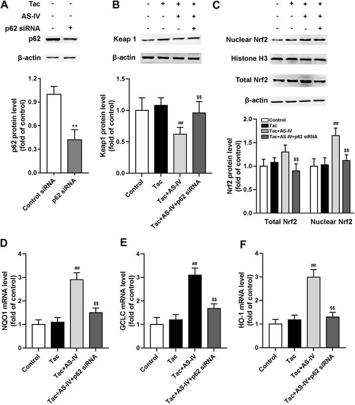 Figure 7. p62 siRNA inhibited Astragaloside IV-induced Nrf2 nuclear translocation and down-stream genes transcription in HK-2 cells via p62-Keap1-Nrf2 pathway. The HK-2 cells were transfected with unconjugated control siRNA or p62 siRNA, and then the protein levels of p62 (n = 4) (A), Keap1 (n = 6) (B), and the nuclear Nrf2 as well as total Nrf2 (n = 6) (C) were detected. The mRNA levels of NQO1 (D), GCLC (E) and HO-1 (F), were evaluated by RT-qPCR (n = 8). **p < 0.01 vs. the Control group; ##p < 0.01 vs. the Tac group; $$p < 0.01 vs. the Tac + AS-IV group.