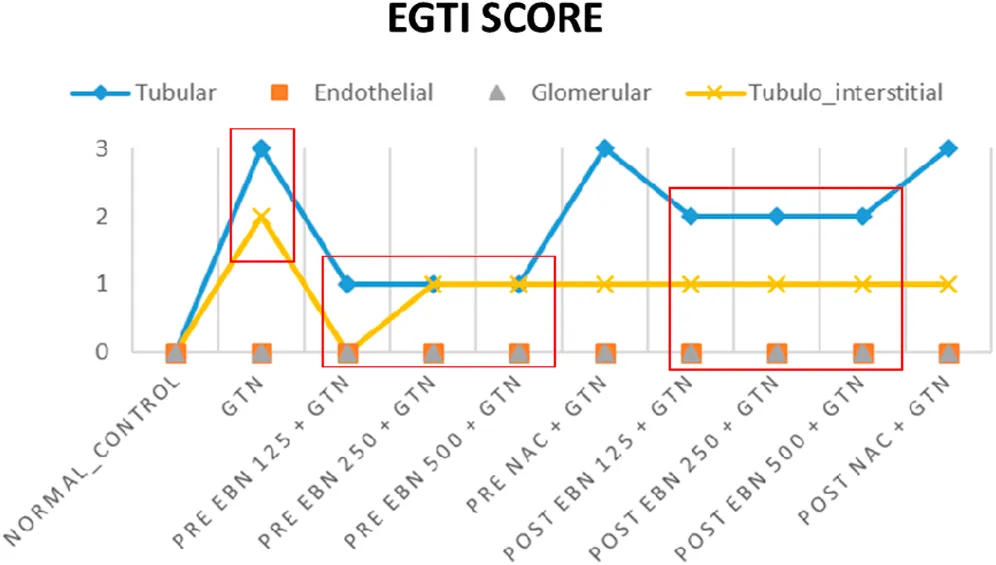 Our renal histological examination demonstrated that pre-treatment with EBN protects the kidneys from the nephrotoxic effect of GTN, whereby the GTN mediated toxicity was either negated or severely attenuated. For those who had received post-treatment EBN, the renal tubules were similarly protected, albeit not as effective as pre-treatment arms, as modest ATN changes from GTN was observed.