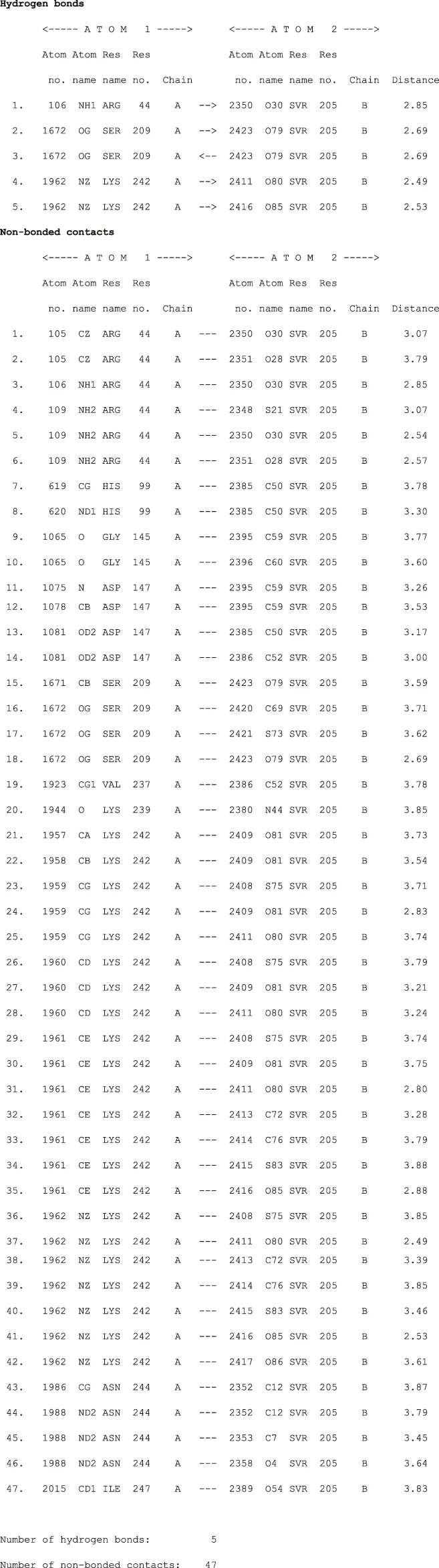 | 1 | LYS43-NZ–GLU203-OE1 | 2.85 | 133.63 |