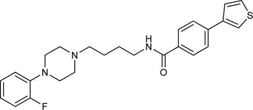 N-phenylpiperazine analogues were used extensively for constructing bitopic ligands against dopamine receptors. Lee et al. synthesized and evaluated a series of N-phenylpiperazine analogues substituted with 3-thiophen and 4-thiazolylphenylfluoride (Supplementary Table S5). They identified several ligands that bind with high affinity to D3R and exhibit considerable selectivity towards D2R. Comparison of the binding results of compounds 33–38 and 39–44 suggests that 39–44 binds to D3R but not to D2R. The replacement of the thiophene ring by a thiazole ring (45–50) led to a decrease in receptor binding selectivity. Compound 39 (Table 1) possessed the highest D3R affinity (Ki = 1.4 nM) and 450-fold selectivity that nominated this compound for in vivo testing. Intraperitoneal administration of 39 led to a significant reduction in DOI-dependent head twitch response in mice and a reduction in AIM scores in dyskinetic hemiparkinsonian rats. These data suggest that compound 39 is able to cross the blood-brain barrier and achieves therapeutic concentrations (Lee et al., 2021).
