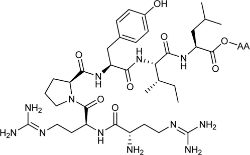 Kling et al. investigated the neurotensin receptor type (NTS) 1 receptor crystal structures (White et al., 2012; Egloff et al., 2014) and found that an allosteric binding site was saturated at the C-terminus of NT (8–13). Following sequence analysis, they confirmed that there is a difference between NTS1R (Arg1493.32) and NTS2R (His1153.32) that may allow for subtype selectivity. Several bitopic ligands of type NT (8–13) were synthesized (Table 2) and compounds (51–56) showed a promising trend in the NTS1R selectivity. The best compound (54) has Ki value of 1.3 nM associated with 26-fold selectivity towards NTS2R. Homology modelling and MD simulations confirmed that the compounds bind in a bitopic mode, with NT (8–13) occupying the orthosteric binding site and the amino acid extension occupying the secondary binding site. These results provide a promising starting point for the design of NTS1R selective agonists (Kling et al., 2019).