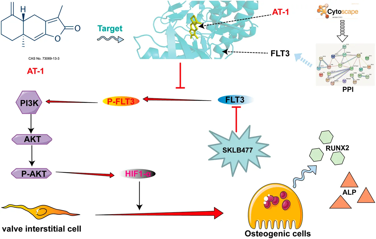 Our results show that AT-1 targeted the FLT3 protein and inhibited the phosphorylation of FLT3, blocking PI3K/AKT pathway activation and reducing the production of HIF1-α, thereby inhibiting the osteogenic differentiation of VICs.