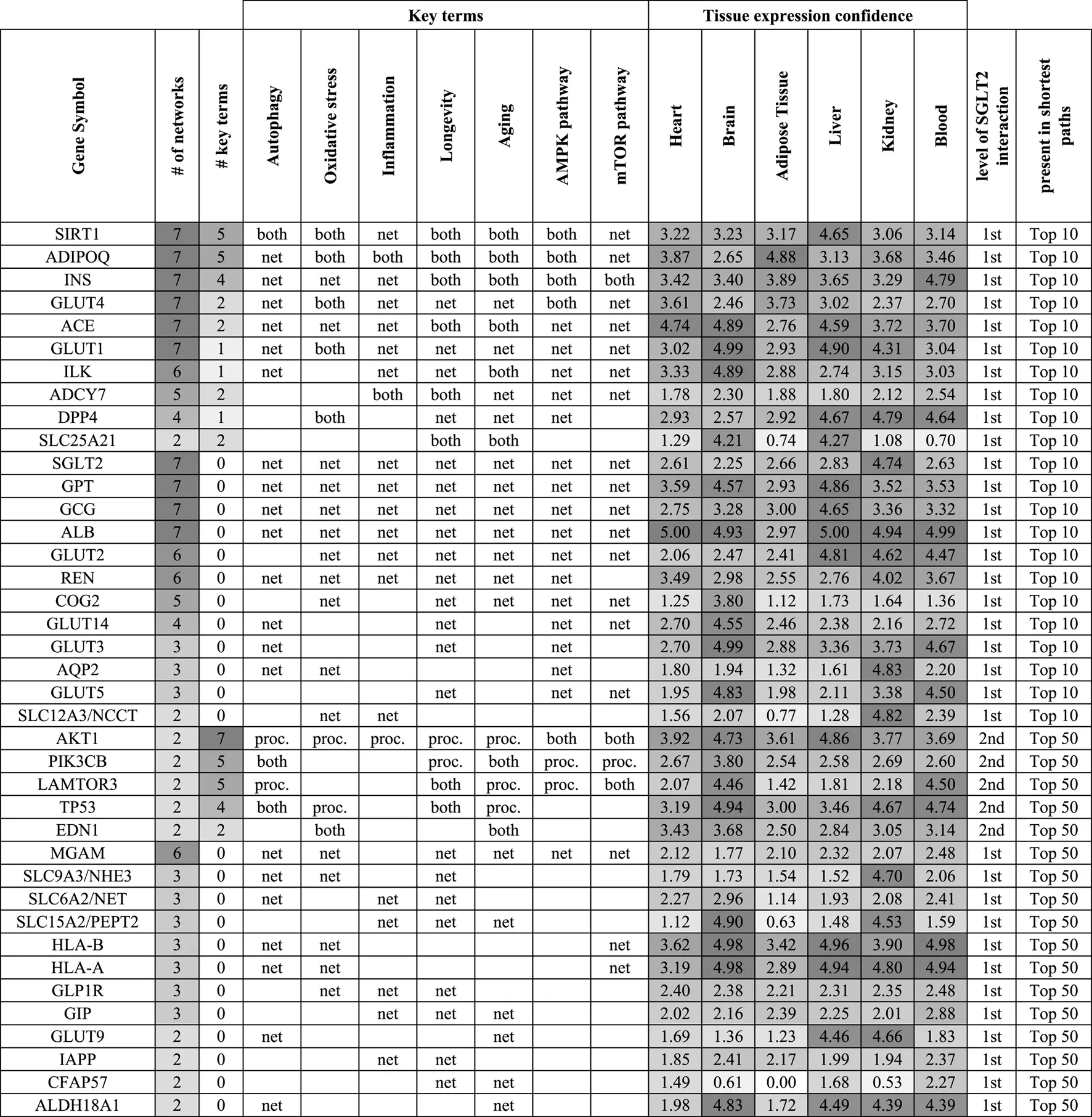 Top genes in the context of the level of their interaction with SGLT2, association with key terms (proc.), and presence in shortest paths analysis (net) for top 10 and 50 pathways. If a gene was associated with a key term and was present in shortest paths analysis was marked as “both”. This approach enabled us to identify interesting genes, which could play a role in SGLT2-related regulation and be involved in key terms/processes. Genes were ordered based on their association with the key terms and presence in the top 10 shortest path analyses. On the table are shown genes that appeared in at least two top 50 shortest path analyses. Tissue expression confidence levels (0-5) were retrieved from the TISSUES 2.0 database.