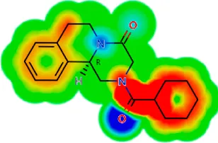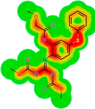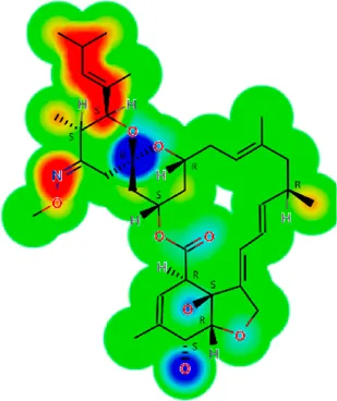 LogS, logarithm of aqueous solubility; logS pH 7.4. logarithm of aqueous solubility at pH 7.4; logP, logarithm of octanol-water partition coefficient; logD, logarithm of organic phase-aqueous phase distribution coefficient at pH 7.4; MW, molecular weight; HBD, hydrogen-bond donors; HBA, hydrogen-bond acceptors; TPSA, topological polar surface area; Flexibility. ratio of rotatable bonds to total bonds. Heat maps for logD. The red-yellow regions contribute positively to the property and the green regions have no influence.