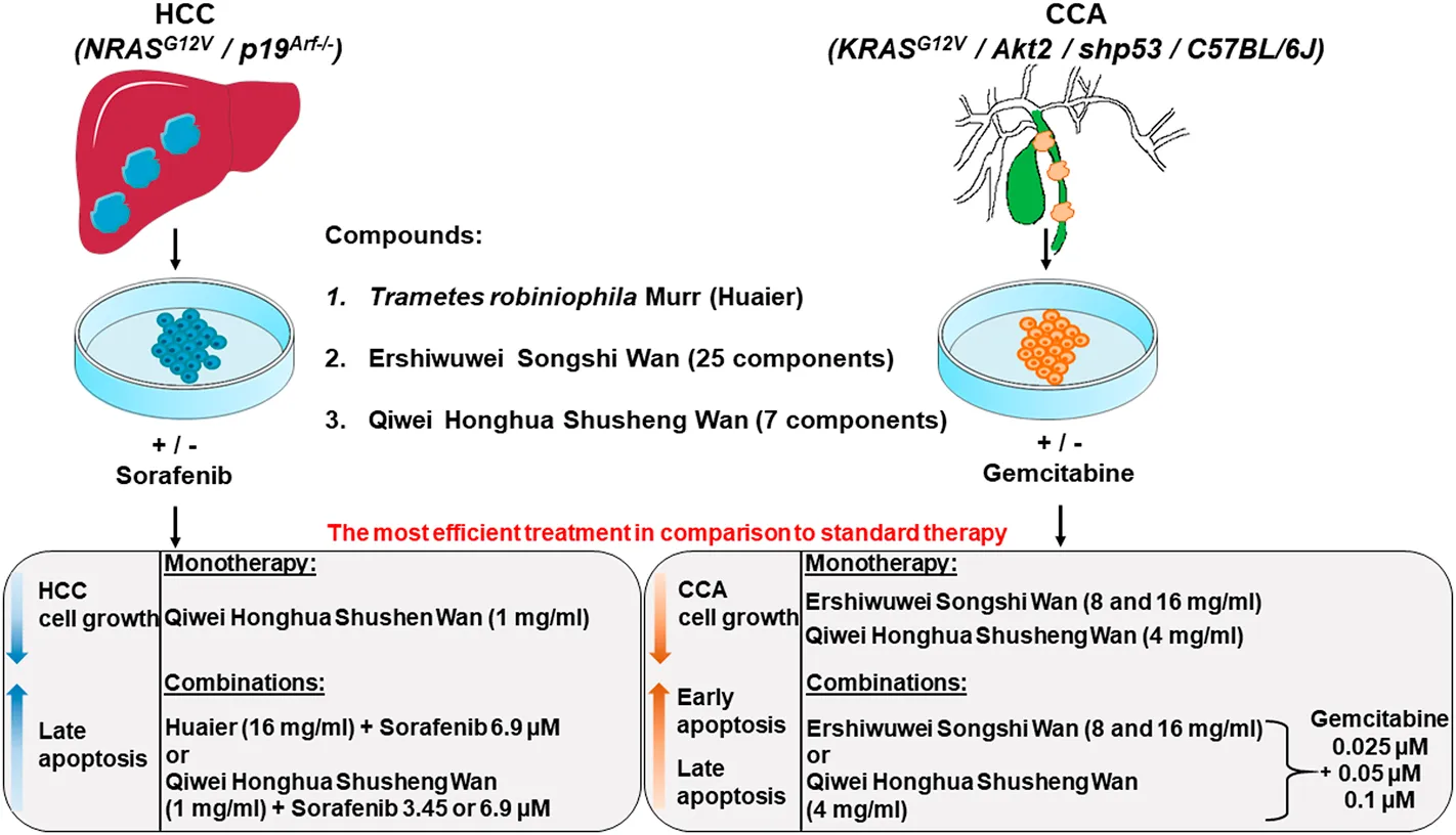 Primary murine HCC and CCA cell lines with known genotypes were used to test the efficacy of TCM (Huaier) and TTM (Ershiwuwei Songshi Wan and Qiwei Honghua Shusheng Wan) applied as monotherapy and in combination with standard chemotherapeutics, sorafenib for HCC and gemcitabine for CCA. The results showed that TCM and TTM and their combination with standard chemotherapeutics were more efficient than the clinical doses of standard chemotherapeutics alone (13.8 μM sorafenib and 50 μM gemcitabine, respectively). In particular, monotherapy with TTM Qiwei Honghua Shusheng Wan and its combination with a half or even quarter dose of sorafenib (6.9 or 3.45 μM), as well as combination of TCM Huaier and 6.9 μM sorafenib strongly inhibited the growth of HCC cells. The HCC cell inhibition relied on the induction of late apoptosis. For CCA, monotherapy with both tested TTM compounds, Ershiwuwei Songshi Wan and Qiwei Honghua Shusheng Wan and their combination with reduced doses of gemcitabine (0.025, 0.05 or 0.1 μM) strongly inhibited CCA cell growth. The CCA cell inhibition relied on the induction of early- and late apoptosis. TCM Huaier was inefficient in CCA. Cellular senescence and necroptosis, induced by the compounds, did not correlate with the protection against HCC and CCA in in vitro studies.