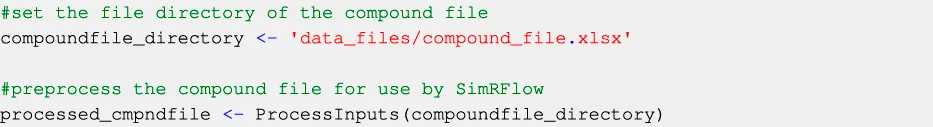 Users must provide a “compound file” (see Section 3.1.1), which is a list of the compounds they wish to simulate and two of their corresponding compound identifiers: The International Chemical Identifier (InChI) key and the simplified molecular-input line-entry system (SMILES) code. InChI keys are used because it is highly improbable that there will be a mismatch between similar compounds when using them to query the databases. SMILES codes are required because they may be used further down the data collection workflow. Before querying the physicochemical databases, the compound file is checked to ensure it contains all the information required to proceed with the workflow. This is done by the ProcessInputs function, which takes the path to the compound file and formats the file into a data structure (processed_cmpndfile) that can be used by subsequent SimRFlow functions (Code Block 1). Users will be notified if the compound file is not properly formatted (see Supplementary Material for further information on formatting the compound file).