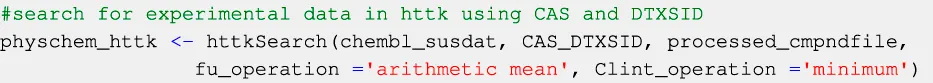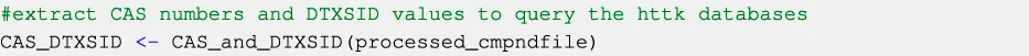 Prior to the incorporation of any available user-provided experimental data, three databases from the httk-R package (available on CRAN 5) (Pearce et al., 2017) are queried for information on CLint, fu, and BP ratio values in humans. These databases are queried using a combination of compound CAS registry numbers 6 and DTXSIDs, 7 since querying the databases with only CAS registry numbers might yield unreliable results. CAS and DTXSIDs are collected from SusDat using the function CAS_and_DTXSID (Code Block 6):