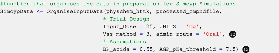 Users may select one of three dose units: milligrams (mg), milligrams per kilogram of body weight (mg/kg), or milligrams per square metre (mg.m−2). Similar to the administration dose, users may provide different dose units for the different compounds within the compound file. Alternatively, they may set the same dose units for all compounds through the UNITS argument of the OrganiseInputData function (see Code Block 9, label ❸). The default dose unit is mg. Only single dose administration is allowed as part of SimRFlow, but accommodations for multiple dose scheduling are underway.