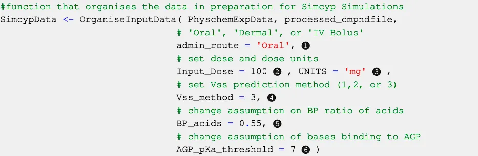 Oral, dermal, and intravenous bolus routes of administration are currently available within this version of SimRFlow, and can be changed through the admin_route argument of the OrganiseInputData function (see Code Block 9, label ❶). The bolus intravenous administration is assumed to have an infusion duration of 30 s. The dermal administration route is assumed to be applied to the back with an area of application of 60 cm2, a formulation thickness of 0.005 cm, and a formulation density of 1 g/mL. Users can only select one of the three administration routes for each batch of compounds to be simulated. The default administration route is oral, and will be selected if users do not specify a different route of administration. Introducing additional administration routes is underway.