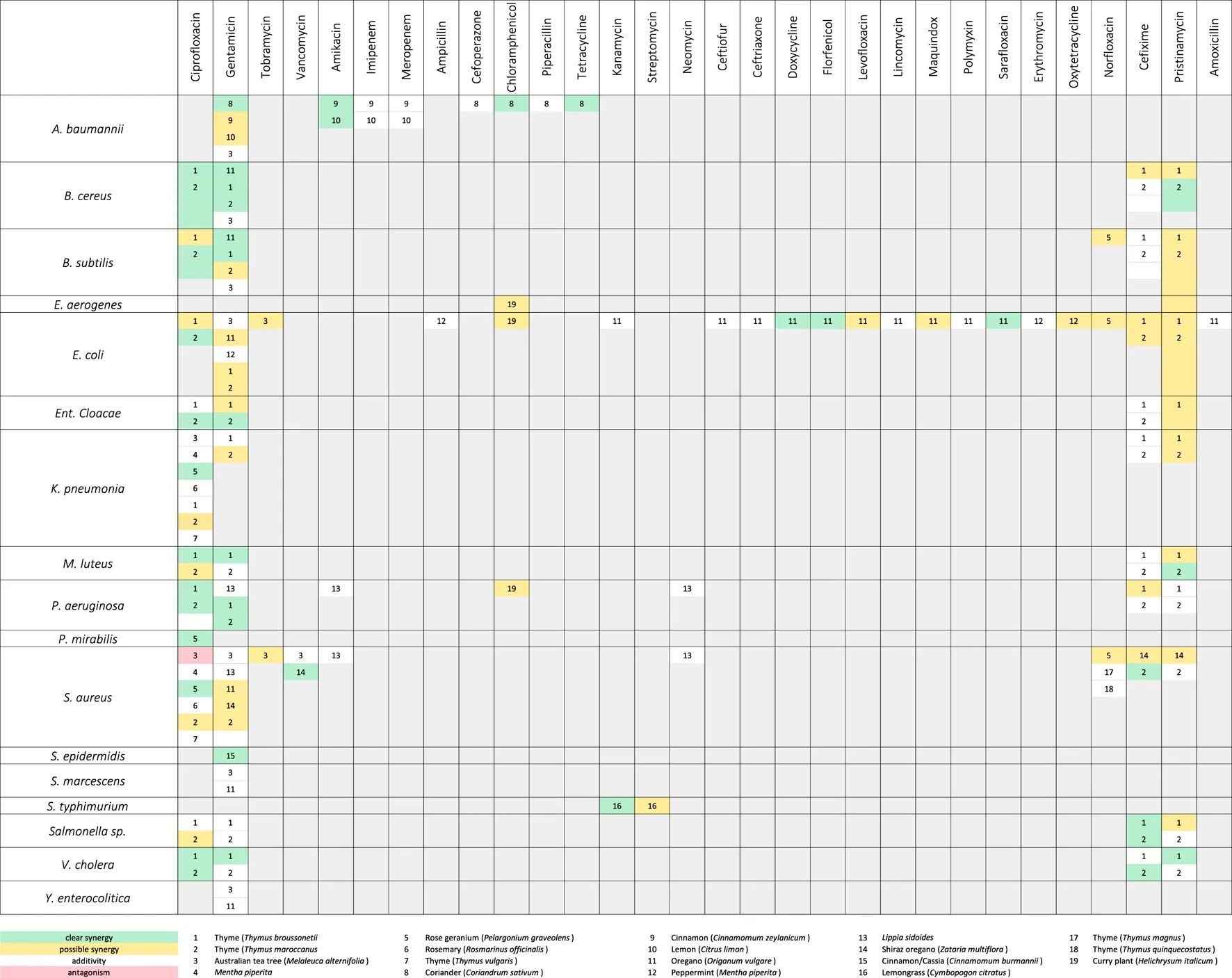 An overview of possible in vitro interactions of further antibiotics with EOs (Table 1) shows that there are still many gaps (empty fields) to be filled in this area of research. The need for research in this direction could be forward-looking. In addition, in vivo studies should be performed that investigate the combination of intravenously administered antibiotics with orally administered EOs.