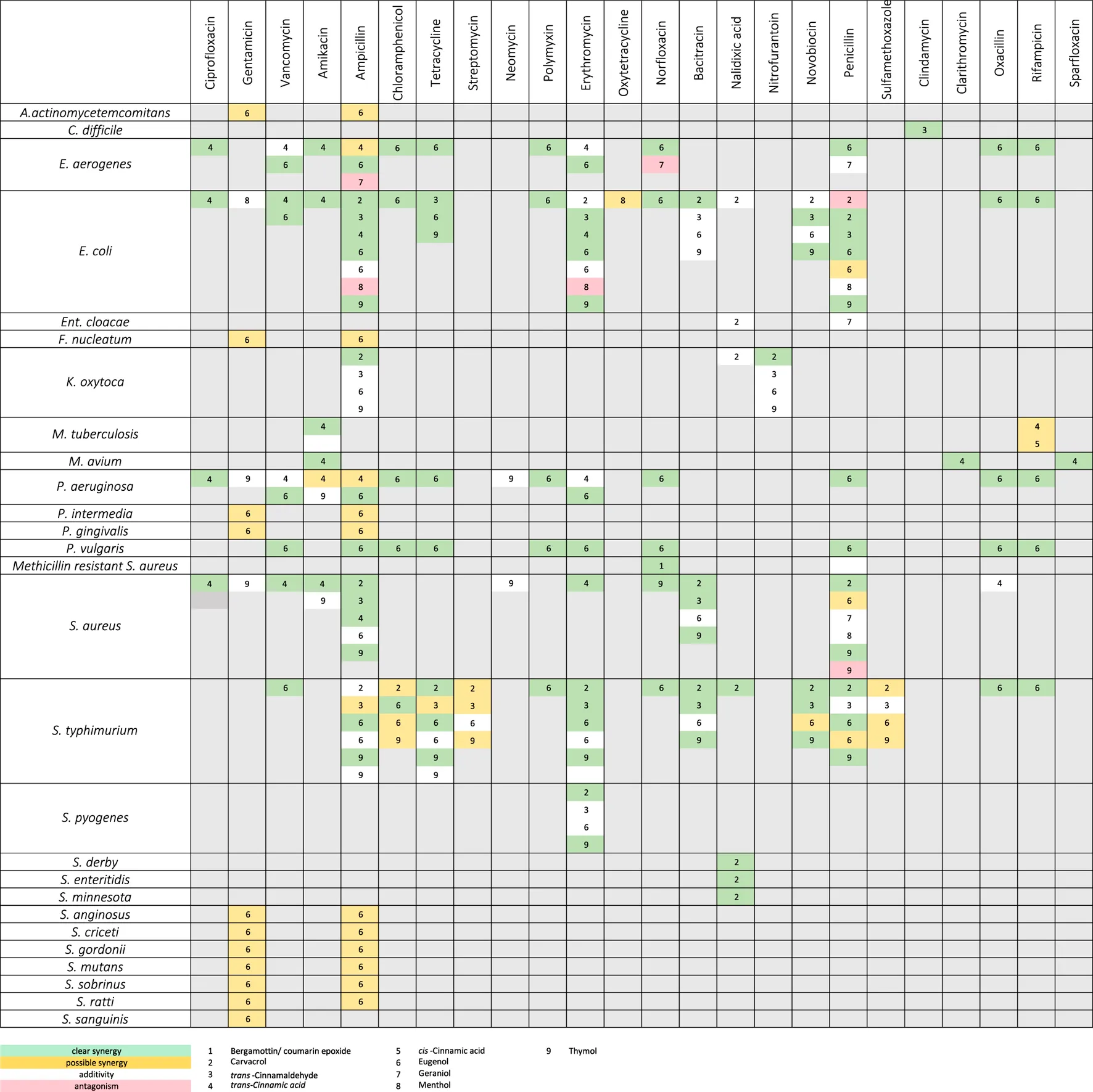 Since the extensive use of antibiotics from 1945 onwards, bacteria have increasingly been selected for resistance to single or multiple (multi-resistance) antibiotics. All over the world, people are aware of the increasing ineffectiveness of these antibiotics and are intensively searching for novel active substances and new targets. Therapeutically used natural derived antibiotics are usually produced by fungi and bacteria, but plants have successfully developed multi-component-based strategies to defend themselves against germs for thousands of years. Thus, it is a promising challenge in the future to develop multi-component-based antibiotic strategies adapted from nature, or at least consist of a combination of MOCS and conventional antibiotics. Studies on EOs and their ingredients in combination with known antibiotic drugs show promising interactions (Tables 1, 2). For example, synergism may occur when different compounds simultaneously attack different sites of a bacterial cell (multi-target effect). Alternatively, there may be pharmacokinetic or physicochemical interactions, such as enhancement of solubility or bioavailability. The most commonly reported test method for assessing interactions with antibiotics is the checkerboard assay with calculation of the FIC (fractional inhibitory concentration) index (Hemaiswarya et al., 2008; Wagner and Ulrich-Merzenich, 2009).