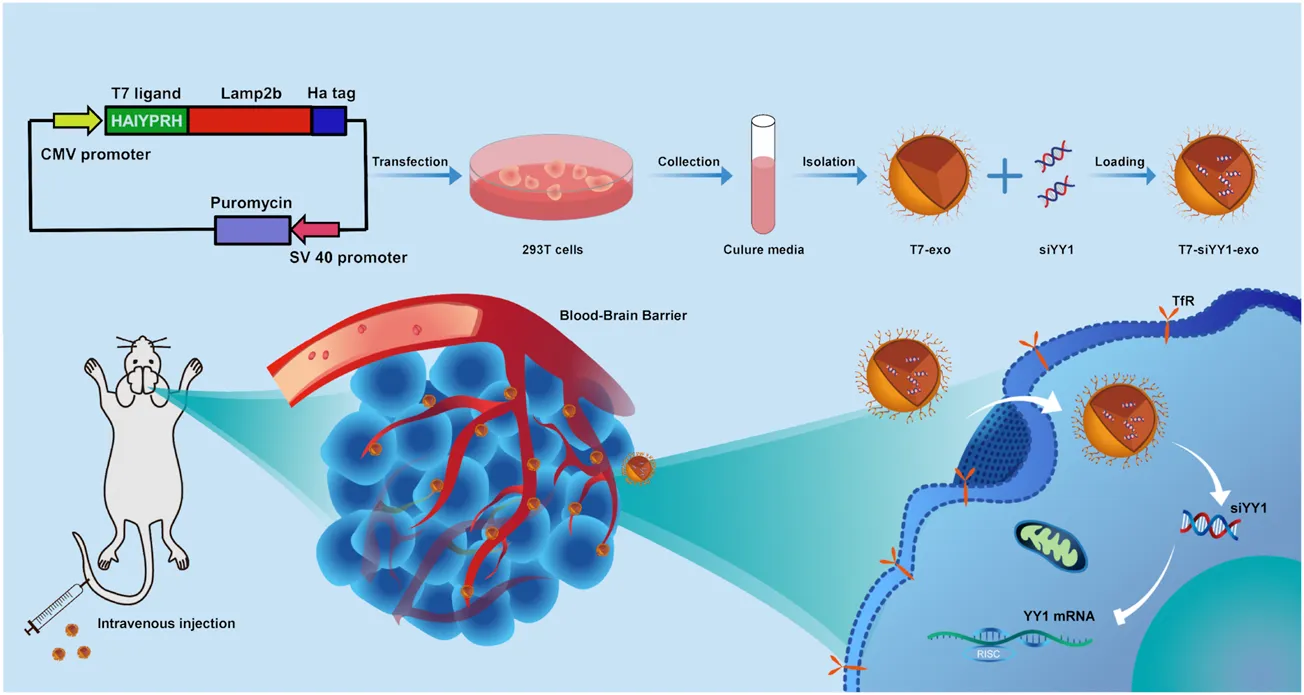 An in-vitro BBB model was established using LN229 and bEnd.3 cells as described previously (Yang et al., 2021). In brief, bEnd.3 cells were seeded into the upper chamber of Transwell inserts coated with 2% gelatin solution and cultured for 7 days in DMEM supplemented with 10% FBS. LN229 cells were seeded in the lower Transwell compartment. Cy3-labeled siYY1 and T7-siYY1-exo were added to the upper chamber to assess the penetration efficiency of free siYY1 and T7-siYY1-exo across the BBB.
