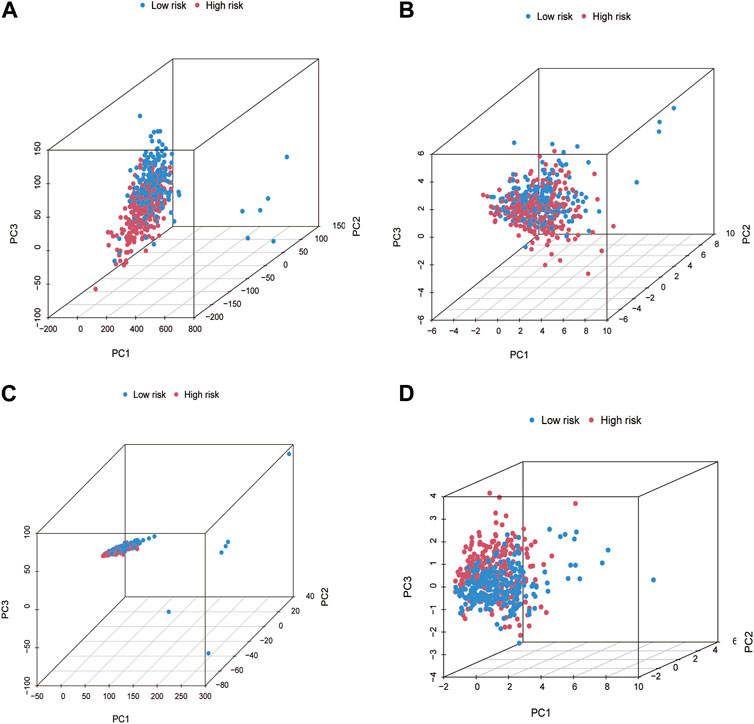 The principal component analysis (PCA) for patients in LRG and HRG. PCA in All genes (A). Cuproptosis genes (B). Cuproptosis-related lncRNAs (C). Risk lncRNAs alone (D).
