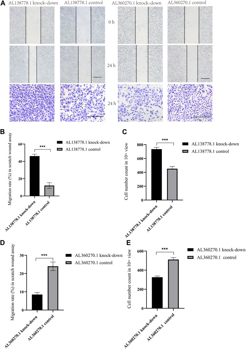 We constructed the AL138778.1 knock-down and AL138778.1 control vector, and the AL360270.1 knock-down and AL138778.1 control vector in the A549 cell line. We then inoculated the cells (1 × 105/well) into a 24-well culture plate and cultivated them in an environment of 37°C, 5% CO2 for 24 h. The culture solution was discarded, and a 10 μL pipette tip was used to scratch the inoculated cells. The cells were then gently washed twice with PBS, and 1 mL RPMI 1640 medium was added. A photograph of each scratch was taken at 0 and 24 h. Each experiment was conducted in 3-line parts and repeated five times. We measured and calculated the migration distance from the original site to the wounded area over 24 h. We placed the cells (5 × 104 cells/well) in a Matrigel plate well containing serum-free RPMI 1640 medium. The lower chamber was then filled with 500 µL of complete medium (RPMI 1640 with 10% FBS). The cells that did not pass the well were lightly cleaned with a cotton swab after incubation at 37°C for 24 h. Glutaraldehyde (5%) was then added in the lower chamber, and the cells were allowed to fix for 10 min. Crystal violet (1%) in 2% ethanol was used to stain the cells at room temperature (approximate temperature range from 15°C to 20°C) for 20 min. We used inverted microscope (OLYMPAS, Japan) to photograph five different sites and counted the numbers in a 10× view average for comparison.