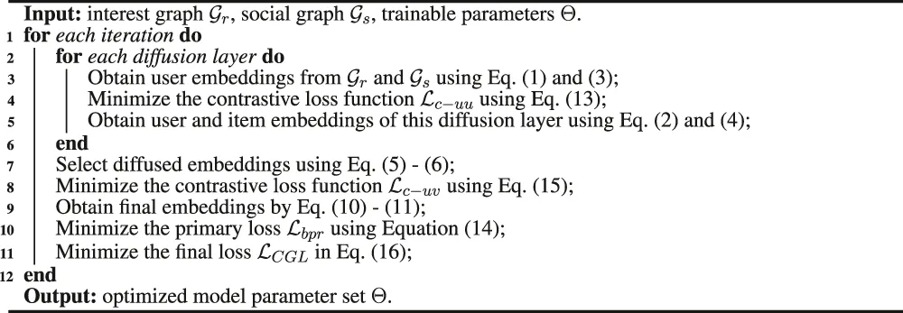 With the above three losses in three modules of the CGL model, we set its final loss aswhere α and β are two additional regularizers to control the strength of and , respectively; Θ is the set of all learnable parameters; and λ controls the strength of L2 regularization. The overall training process of CGL is given in Algorithm 1.