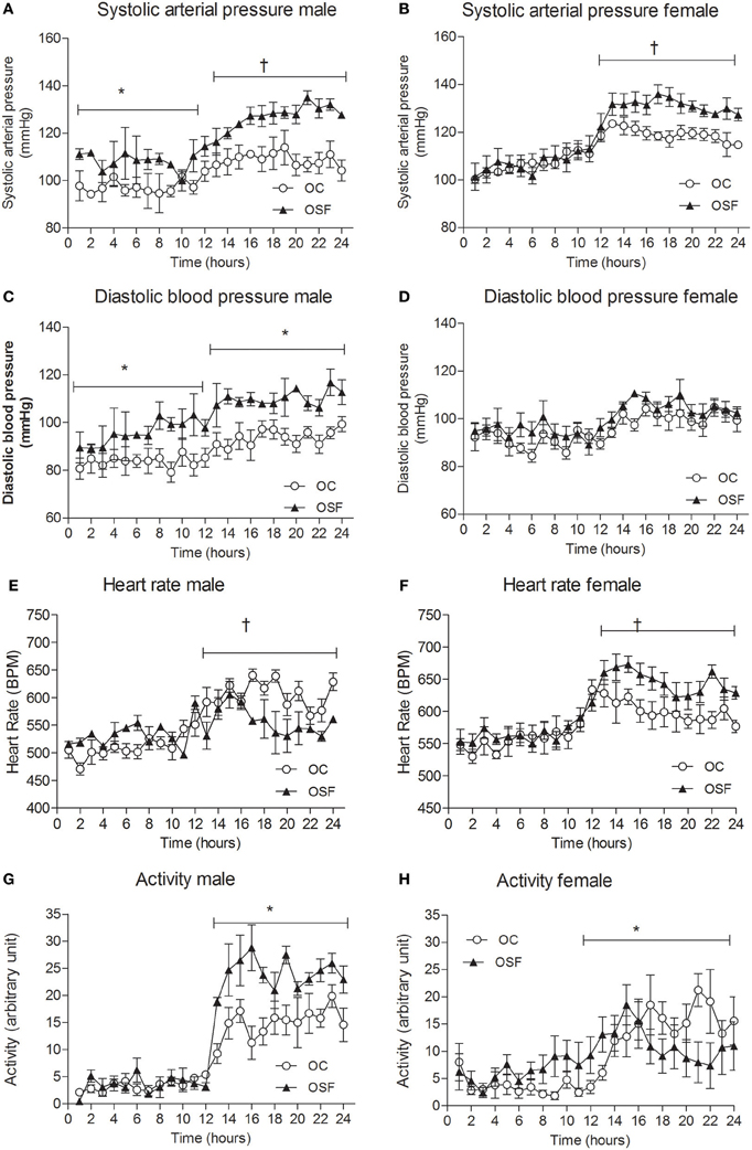 Figure 4. Cardiovascular parameters at 3 months. Systolic arterial pressure (A,B), diastolic arterial pressure (C,D), heart rate (E,F), and locomotor activity (G,H) in 3-month old male and female offspring of control (OC, open symbols, n = 8) and sucrose fed dams (OSF, closed symbols, n = 6), *P < 0.05; †P < 0.01 vs. control, using two-way repeated measure ANOVA (diet × time) and Greenhouse–Geisser.