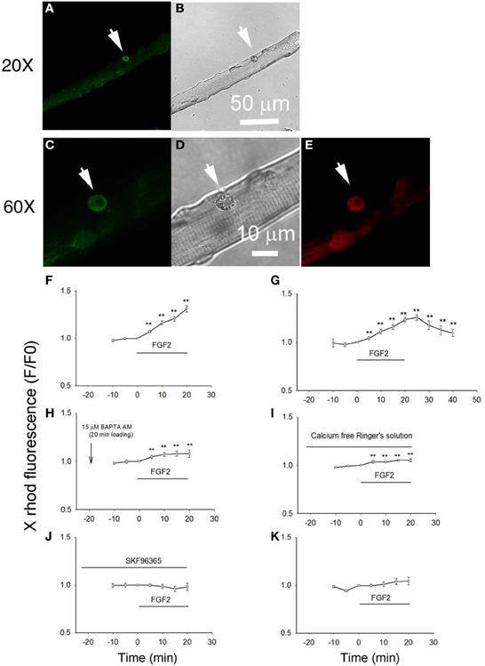 Figure 4. Studying the effects of FGF2 on cellular calcium in satellite cells associated with host FDB fibers. Muscle cultures pre-stained with anti-CD34-FITC to identify satellite cells (A,C) were then loaded with calcium indicator X rhod-1 AM (E). Transmitted light images are shown in (B,D). Application of FGF2 at 2 ng/ml to the culture triggered a rise of calcium in the satellite cell in the confocal image plane (F; 9 satellite cells from 2 mice). Rinse with Ringer's solution without FGF2 reverses the rise in cell calcium (G; 9 cells from 2 mice). In cultures pre-loaded with calcium chelator BAPTA AM FGF2 caused little increase in calcium (H; 8 cells from 2 mice). In cultures rinsed with calcium free Ringer's solution, the effects of FGF2 are minimal (I; 8 cells from 2 mice). Incubation with TRPC blocker SKF 96365 attenuated the effects of FGF2 on cellular calcium (J; 8 satellite cells from 2 mice). FGF2 has no effects on cellular calcium of FDB fibers (K; 11 FDB fibers from 2 mice). **p < 0.01, compared to 0 min.