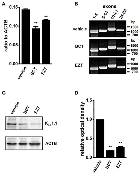 Figure 4. Down-regulation of KCa1.1 transcripts and proteins in MDA-MB-453 cells by treatments with antiandrogens for 48 h. (A) Real-time PCR assay for KCa1.1 in vehicle-, 1 μM BCT-, and 1 μM EZT-treated MDA-MB-453 cells (n = 4 for each). Expression levels were expressed as a ratio to ACTB. (B) Band patterns on agarose gels for the PCR products of KCa1.1 exons (exons 1–4, 5–14, 15–23, and 24–30) in vehicle-, 1 μM BCT-, and 1 μM EZT-treated MDA-MB-453 cells. A DNA molecular weight marker is indicated on the right of the gel. (C) Protein lysates of vehicle-, 1 μM BCT-, and 1 μM EZT-treated MDA-MB-453 cells were probed by immunoblotting with anti-KCa1.1 (upper panel) and anti-ACTB (lower panel) antibodies on the same filter. (D) Summarized results were obtained as the optical density of KCa1.1 and ACTB band signals. After compensation for the optical density of the KCa1.1 protein band signal with that of the ACTB signal, the KCa1.1 signal in the vehicle control was expressed as 1.0 (n = 3 for each). Results are expressed as means ± SEM. **p < 0.01 vs. the vehicle control.