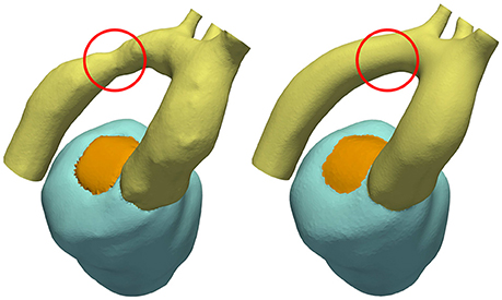 where denote the cutoff faces as indicated by blue lines in Figure 1; are surfaces subject to pressure; and are surfaces with homogeneous Neumann boundary conditions. In order to avoid numerical difficulties with non-smooth, jagged boundaries, the surface of the mechanical blood pool domain was extracted and smoothed using the VMTK toolbox5 (Antiga et al., 2008). The smoothed surface, , was used to define the boundary of the fluid domain reference configuration, , for volumetric FE meshing using ANSYS ICEM CFD6. Refined boundary layers were included in this process to better resolve sharp gradients in the vicinity of occurring during simulation of hemodynamics. The various processing stages for building EM and CFD models are illustrated in Figures 1, 4, respectively.