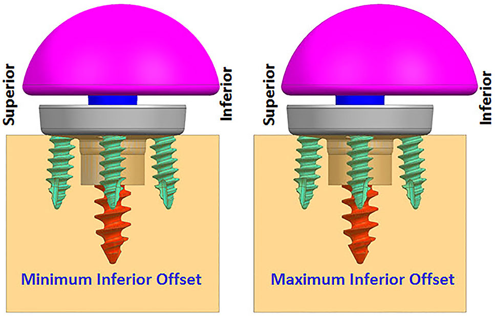 While infinite combinations of eccentricities in anterior-posterior and inferior–superior directions are available by allowable glenosphere rotations through use of an adapter, two combinations of offsets in inferior-superior directions were selected, (1) Minimum inferior superior offset and (2) Maximum inferior offset. A minimum offset of 0.5 mm and 1.5 mm was used for the 28 mm and 25 mm baseplate, respectively, based on the glenosphere compatibility. For both baseplates, a maximum offset of 3.5 mm was used.