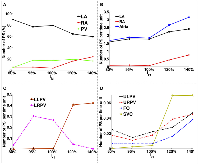 Figure 4. PS location variation as a function of IK1 for atria with no fibrosis. (A) Percentage of PS locations on the LA body, on the RA and on the PVs. (B) Number of PSs per unit time on the entire LA, on the RA and on the whole atria. (C) Number of PSs per time unit on the LLPV and on the LRPV. (D) Number of PSs per unit time on the ULPV, URPV, FO, and SVC.