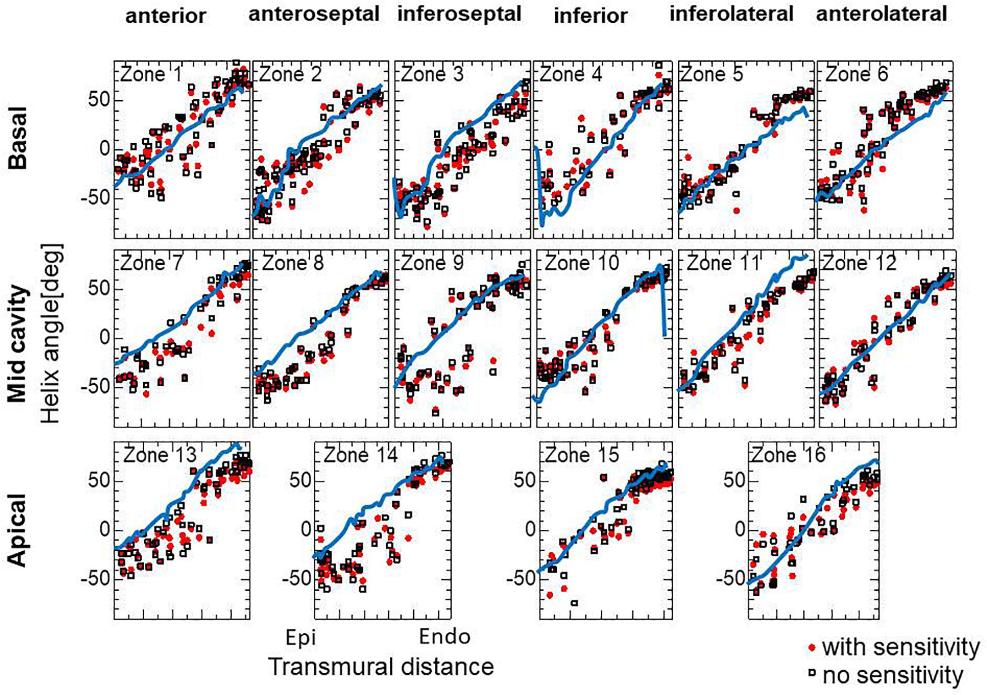 Figure 4. Transmural helical angle arrangement of the optimized fiber structure in American Heart Association segments (The zones 1–16 are shown in Supplementary Material S2). The red dots and black squares were obtained by the reorientation processes with and without the insensitivity mechanism, respectively, and the blue lines were digitized from the diffusion tensor magnetic resonance imaging study reported by Lombaert et al. (2012), which averaged the data obtained from 10 healthy human hearts.
