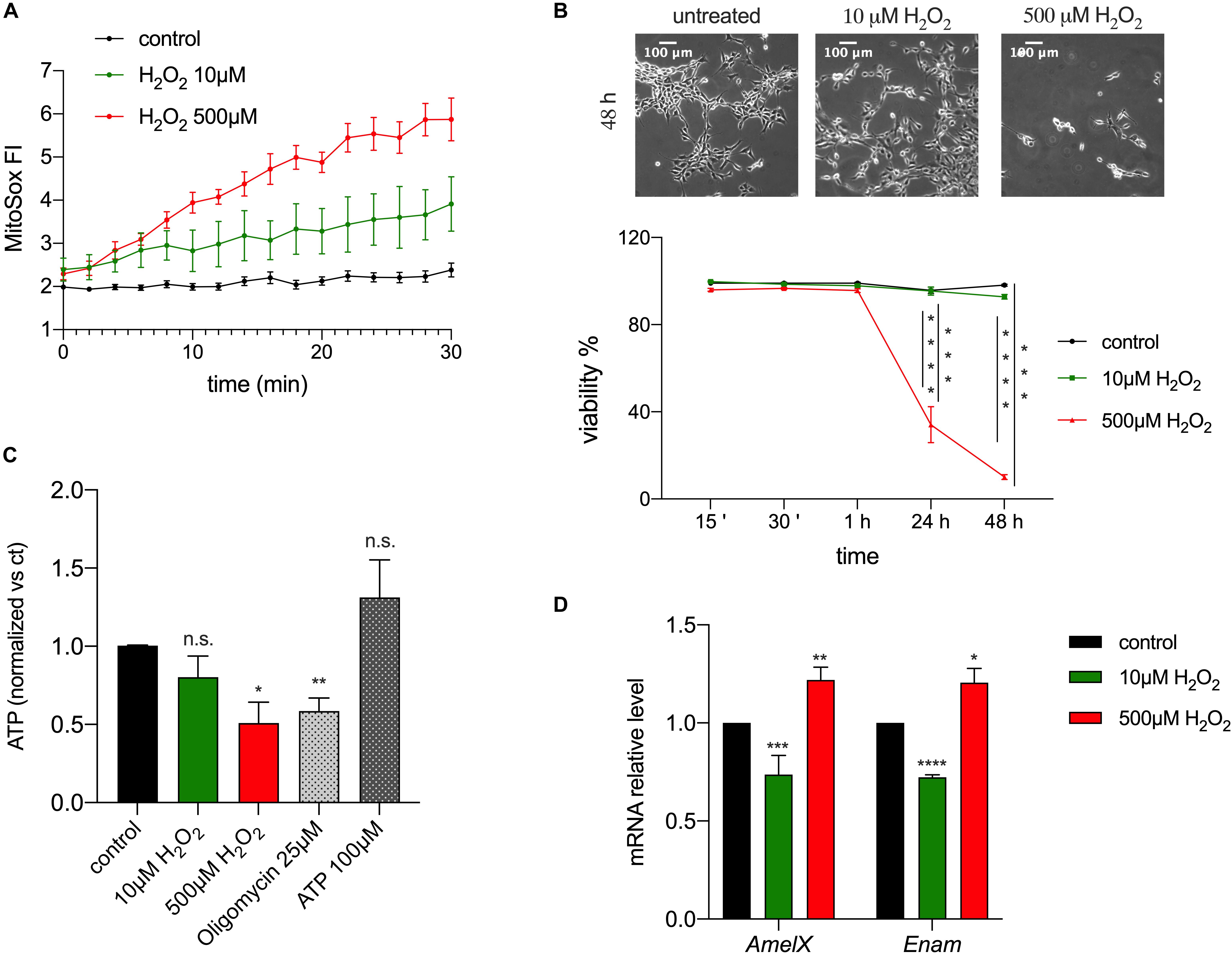 Figure 4. ROS modulates enamel gene expression. (A) H2O2 treatment of LS8 cells elicited a dose dependent enhancement of the MitoSOX fluorescence. (B) LS8 cells viability was significantly decreased upon treatment with H2O2 500 μM, but not 10 μM (scale bar = 100 μm). (C) ATP content decreased when LS8 cells were exposed to 500 μM of H2O2 after 15 min. (D) LS8 cells exposed to both H2O2 concentrations (10 and 500 μM) show altered expression of AmelX and Enam mRNA levels. Data represent mean ± SEM from a minimum of three independent experiments (*P < 0.05, **P < 0.005, ***P < 0.0001, two tailed unpaired Student’s t-test).