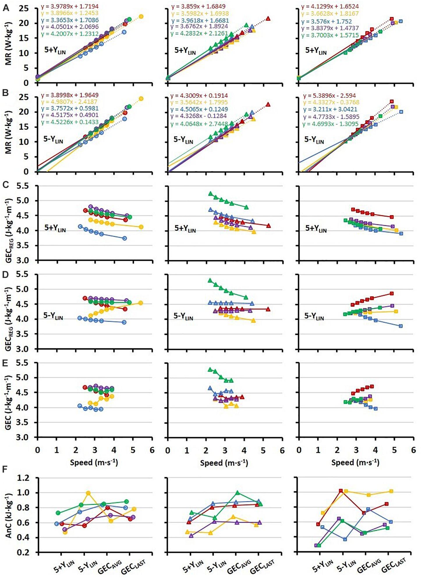 All individual regression lines between speed and MR are shown in Figures 2A,B for the 5+YLIN and 5-YLIN models, respectively. The GEC calculated from the two regression equations (GECREG) for the five submaximal speeds and the TT speed is presented in Figures 2C,D for the 5+YLIN and 5-YLIN models, respectively, whereas the directly measured GEC is presented in Figure 2E. It can be seen that the inclusion of a Y-intercept value in the linear regression (i.e., the 5+YLIN model) resulted in a decline in GEC with increasing speed for all participants, which deviates from the somewhat mixed speed-GEC patterns presented in Figures 2D,E. The within-participant disagreement in estimated AnC for the four different models is illustrated in Figure 2F.