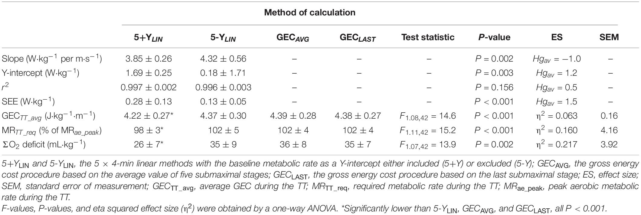 5+YLIN and 5-YLIN, the 5 × 4-min linear methods with the baseline metabolic rate as a Y-intercept either included (5+Y) or excluded (5-Y); GECAVG, the gross energy cost procedure based on the average value of five submaximal stages; GECLAST, the gross energy cost procedure based on the last submaximal stage; ES, effect size; SEM, standard error of measurement; GECTT_avg, average GEC during the TT; MRTT_req, required metabolic rate during the TT; MRae_peak, peak aerobic metabolic rate during the TT. F-values, P-values, and eta squared effect size (η2) were obtained by a one-way ANOVA. *Significantly lower than 5-YLIN, GECAVG, and GECLAST, all P < 0.001.
