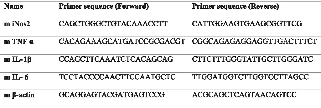 RAW 264.7 cells were treated with LPS as described in the earlier sections (6×105 in a six well plate and stimulated with 50ng/ml LPS along with different concentrations of BSE). After 16h of treatment, total cellular RNA was isolated using Trizol reagent® (Ambion, Life Technologies), followed by RNase-free DNase I treatment (Thermo Fisher Scientific) to remove any genomic DNA. One microgram of total RNA was reverse transcribed into cDNA using the revert-aid first strand cDNA synthesis kit (Thermo Fisher Scientific), and quantitative real-time PCR (qRT-PCR) was performed using the SYBR Green qPCR master mix (Thermo Scientific) using Light cycler 96 (Roche Life Science). β-actin gene expression was used as housekeeping control. The following primers were used for the analysis.