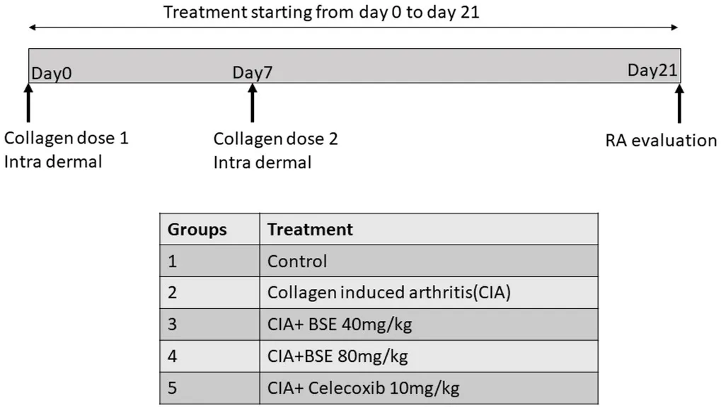 Chicken type II collagen (CII, 2mg/ml in 0.1M acetic acid, dissolved overnight at 4°C) was emulsified in an equal volume of complete Freund’s adjuvant (CFA) prepared by dissolving heat-inactivated Bacillus Calmette-Guerin in IFA to a final concentration of 0.5mg/ml. Rats were immunized with 0.2ml of CII emulsion at the base of the tail by the intradermal route. On day 7, a booster dose was administered (Rosloniec et al., 2001). Immunized rats received BSE (40 and 80mg/kg per day or celecoxib 10mg/kg by oral gavage) or vehicle, starting from day 0 to 21. The test formulations were suspended in 0.5% sodium carboxymethylcellulose and dosed at the volume of 10ml/kg body weight. At the end of the study, rats were euthanized by decapitation by cervical dislocation as per the American Veterinary Medical Association guidelines by a trained veterinary physician (Leary et al., 2020). Blood (1ml) and synovial fluid (0.8–1ml) were collected from all the animals for biochemical analysis.