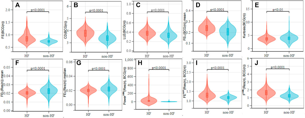 FIGURE 7. Value distribution of each feature over the HF and non-HF classes. (A–E) are BCG features; (F, G) are respiratory signal features; (H–J) are cardiopulmonary features. Non-parametric tests were used between groups.