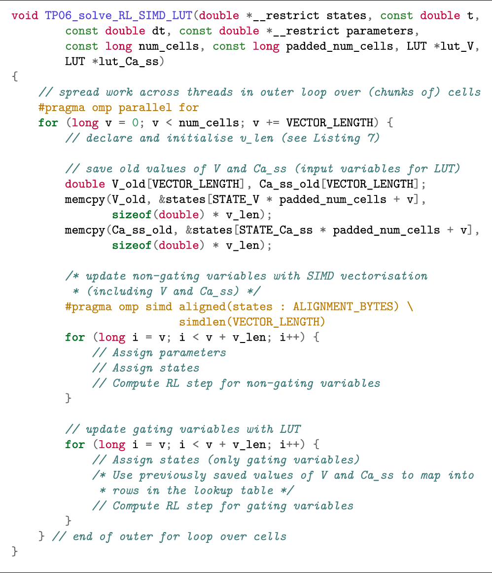Reconciling the scattered memory access patterns arising from the use of lookup tables with the need for contiguous memory accesses for effective use of SIMD vectorisation is non-trivial. We propose a partitioned method for the TP06 model where lookup tables are used for the 12 gating variables, and the non-gating variables are computed using SIMD vectorisation. The rationale for this partitioned method is that computing the gating equations using lookup tables is very effective. Specifically, updating each gating variable requires only eight FLOPs: two FLOPs for Eq. (7), in addition to the three FLOPs required for the linear interpolation of each of the two pre-tabulated expressions (a and b). Listing 8 shows the code skeleton with two inner loops.