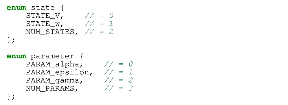 As an example, we will show in Listing 2 a piece of auto-generated code that implements a single FE step for the two-variable FitzHugh-Nagumo (FHN) cell model [see FitzHugh (1961); Nagumo et al. (1962)]:where v and w are state variables, and α, ɛ and γ are model parameters. Correspondingly, Listing 1 contains two assisting enum types that are used instead of integer literals when indexing arrays in order to improve readability. The FHN model is used in code listings in this section due to its simplicity. The results presented in Section 3 use the more realistic models listed in Table 1.