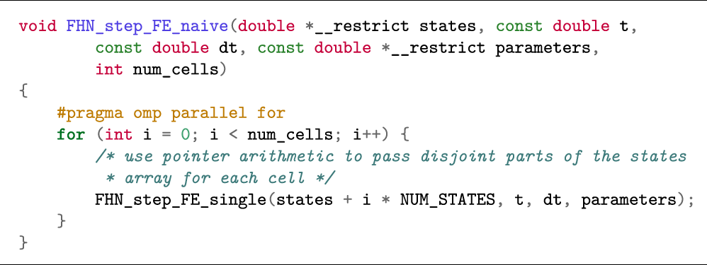 However, we can only label the above auto-generated code as naïve, because the obtained performance will be considerably lower than the ideally achievable level. The main reason is the inability of compilers to enable SIMD vectorisation for this code. Specifically, the first argument to function FHN_step_FE_single in Listing 2 assumes that the N state variables for each cell are stored contiguously in memory. This means that the state variables of all the cells are stored logically as an “array of structs”, as used by Listing 3. Although such a data structure makes sense by grouping the state variables of each cell, the downside is that compiler-supported SIMD vectorisation will fail completely. Code restructuring needed for auto-vectorisation will be addressed in Section 2.3, whereas the potential performance benefits of using lookup tables will be the topic of Section 2.4.