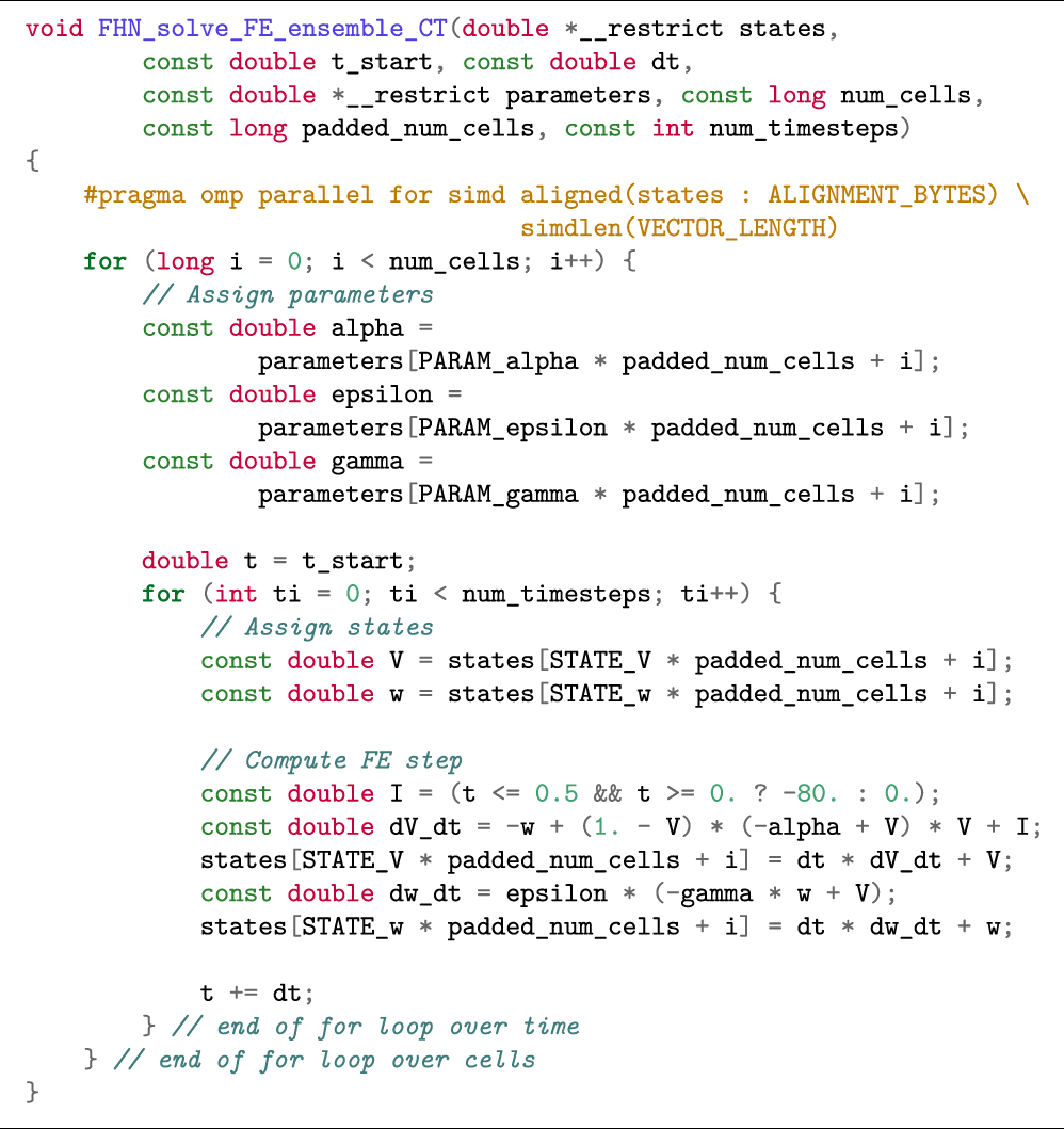 Listing 6 uses a Time–Cell loop structure similar to the simulation scenario, with the difference being that the parameters are no longer shared between all cells. This loop structure can lead to very high memory traffic, because all parameters must be read and all state variables read and written for each inner iteration in the loop. The three code blocks following the comments “Assign parameters”, “Assign states”, and “Compute FE step” are the same as in Listing 5 and were omitted for brevity.