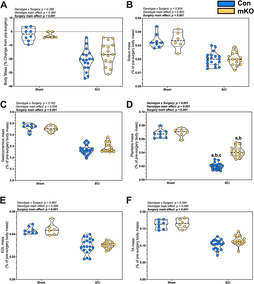 Figure 1. Changes in body and tissue mass 15 days after a complete transection SCI. (A) Percent change in body mass. Normalized wet tissue mass at the time of euthanasia for the (B) soleus, (C) gastrocnemius, (D) plantaris, (E) EDL, and (F) TA. Data are shown as violin plots with individual data points. Thin dashed lines represent quartiles, with the thick dashed line representing the mean. (A) = adj. p < 0.050 vs. Con-sham; (B) = adj. p < 0.050 vs. mKO-SCI; and (C) = adj. p < 0.050 vs. mKO-SCI. Group sizes: Con-sham (n = 8, 4M/4F), mKO-sham (n = 6, 3M/3F), Con-tSCI (n = 19, 10M/9F), and mKO-tSCI (n = 15, 4M/11F).