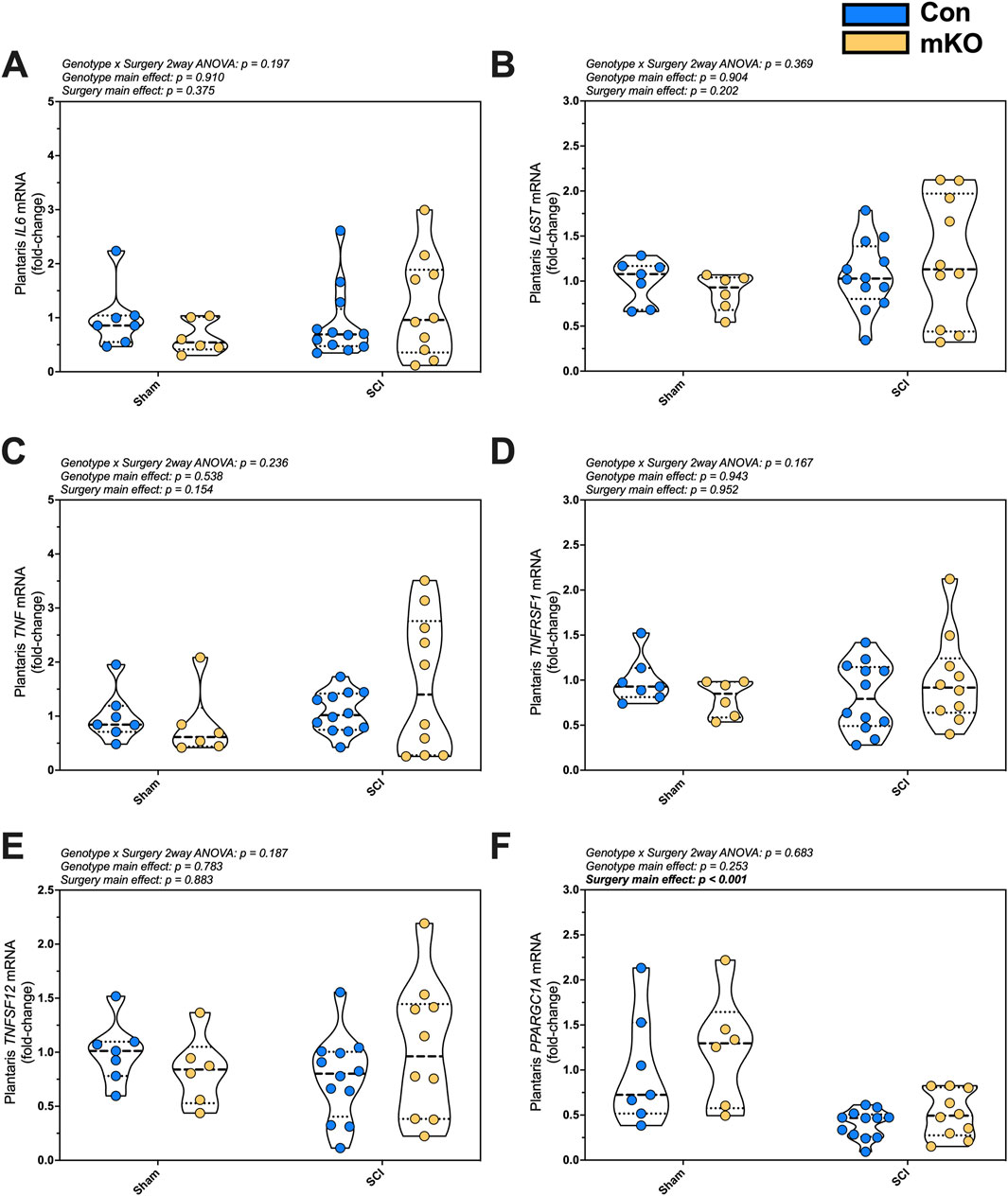 Figure 2. mRNA expression of key proinflammatory and mitochondrial markers in the plantaris after complete SCI. Expression of the cytokine (A) IL6 and the signaling component of its receptor (B) IL6ST (encoding gp130). Gene expression of factors required for the activation of NF-κB signaling: (C) TNF, (D) TNFRSF1, and (E) TNFSF12. mRNA levels of the key mitochondrial biogenesis regulator (F) PPARGC1A. Data are shown as violin plots with individual data points. Thin dashed lines represent quartiles, with the thick dashed line representing the mean. Group sizes: Con-sham (n = 7, 4M/3F), mKO-sham (n = 6, 3M/3F), Con-tSCI (n = 12, 6M/6F), and mKO-tSCI (n = 10, 4M/6F).