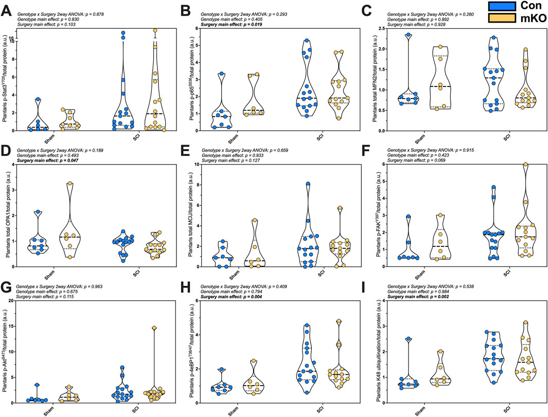 Figure 3. Plantaris whole-muscle protein expression following complete SCI. Phosphorylated protein expression for activated inflammasome markers (A) pSTAT3Y705 and (B) p-p65-NF-κBS536. Total protein expression of regulators of mitochondrial function: (C) mfn2, (D) OPA1, and (E) MCU. Phosphorylation of key activation sites for the mechanosensor (F) p-FAKY397, the mTORC2 target (G) p-AktS473, and downstream translational regulator (H) p-4eBP1T36/47. Lastly, (I) smear of K48-linked ubiquitin. Data are shown as violin plots with individual data points. Thin dashed lines represent quartiles, with the thick dashed line representing the mean. Group sizes: Con-sham (n = 7, 4M/3F), mKO-sham (n = 6, 3M/3F), Con-tSCI (n = 15, 8M/7F), and mKO-tSCI (n = 13, 4M/9F).