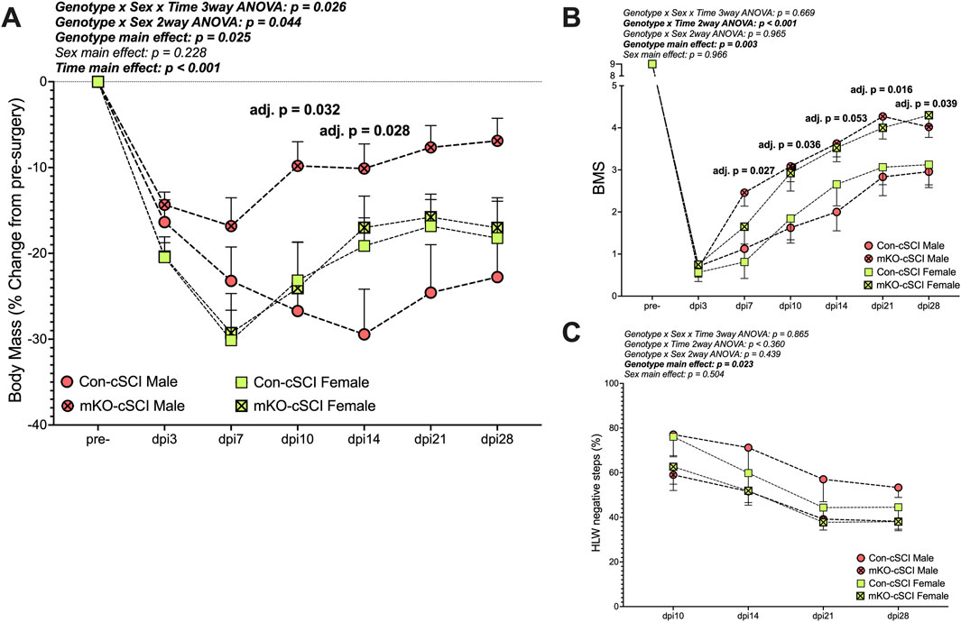 There was a “genotype x sex x time” interaction effect for the percent change in body mass (Figure 4A; p = 0.026). Follow-up two-way ANOVAs highlighted the “genotype x sex” interaction as statistically meaningful (p = 0.044). Simple-effect follow-up testing within time points demonstrated group differences in the males, with the mKO-cSCI mice having higher relative body mass (less weight loss) at dpi10 (adj. p = 0.032) and dpi14 (adj. p = 0.028) than Con-cSCI mice; body weights for mKO-cSCI mice appeared to remain higher than that of Con-cSCI mice until dpi28, although this effect did not reach our statistical threshold (adj. p = 0.101 at dpi14, and p = 0.080 at dpi28); there was no differential response for female mice.
