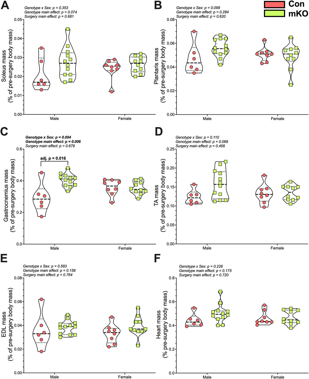 There were no differences in soleus or plantaris masses among the groups (Figures 5A, B). There was a “genotype x sex” interaction for the gastrocnemius, with follow-up testing showing greater mass in the male mKO-cSCI mice than in the male Con-SCI group (Figure 5C; adj. p = 0.001). There were no differences noted for the TA, EDL, or heart mass among the groups (Figures 5D–F).