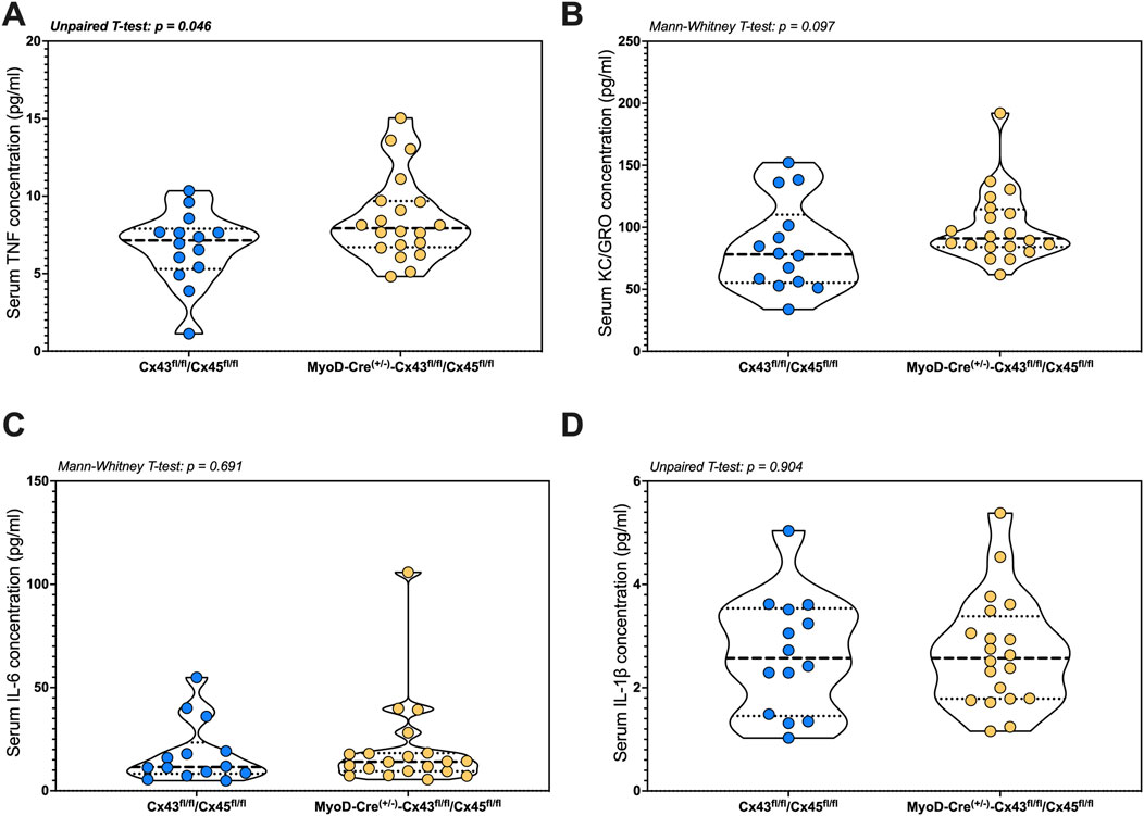 Figure 6. Circulating markers of inflammation following SCI between genotype controls and muscle-restricted knockouts. Serum concentrations for cytokines that were detected in the quantifiable range: (A) TNF, (B) KC/GRO, (C) IL-6, and (D) IL-1β. Data are shown as violin plots with individual data points. Thin dashed lines represent quartiles, with the thick dashed line representing the mean. Con-cSCI (n = 14, 8F/6M) and mKO-cSCI (n = 20, 19F/11M).