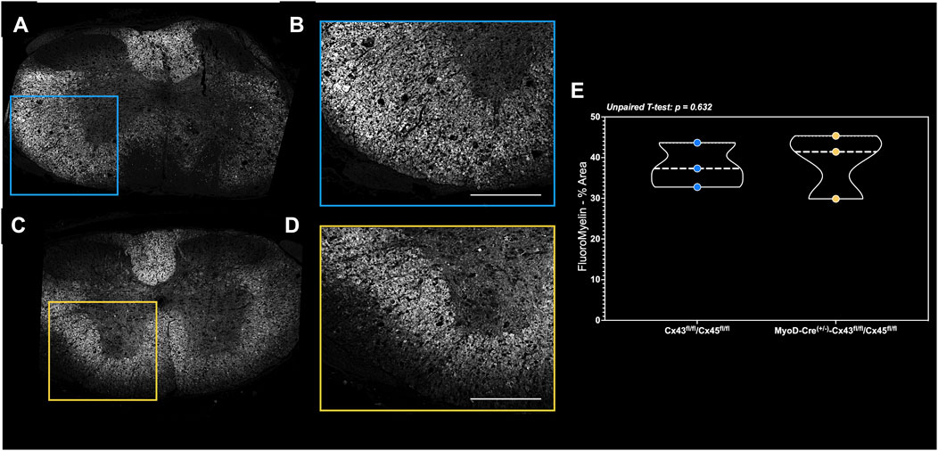 Figure 7. FluoroMyelin staining of perfusion-fixed spinal cords in a subset of mice. Spinal cord cross-sections of the (A) complete lesion FluoroMyelin stain and (B) quantified inset for the Con-cSCI mice. Similarly, (C) complete lesion FluoroMyelin stain and (D) quantified inset for the mKO-cSCI mice. (E) Quantification of FluoroMyelin staining as the percent area of inset. Data are shown as violin plots with individual data points. Thin dashed lines represent quartiles, with the thick dashed line representing the mean. Con-cSCI (n = 3, 2F/1M) and mKO-cSCI (n = 3, 2F/1M). Scale bar = 500 µm.
