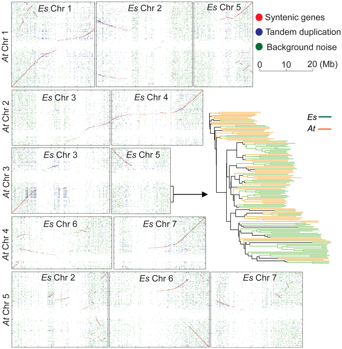 Figure 5. Chromosome-scale synteny between A. thaliana and E. salsugineum. Each dot represents a pair of orthologs between A. thaliana and E. salsugineum. Red dots, macro-synteny orthologs. Blue dots, tandemly duplicated orthologs. Green dots, background noise.