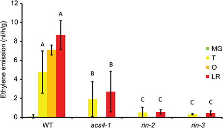 Figure 2. Ethylene emission from fruits. The graph shows ethylene emission levels at four ripening stages in the wild-type and at two ripening stages in the mutants. Values represent the average of 3 plants (4–6 fruits per plant), ±SD. For statistical analysis, ethylene emissions were compared among the same developmental stage, with different letter indicating a significant difference of at least P < 0.05.