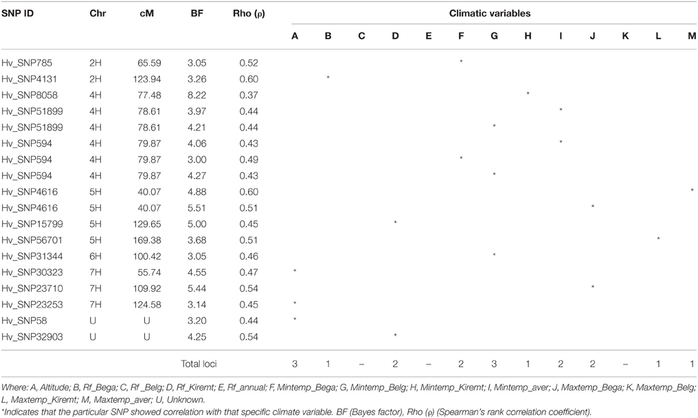 Table 1. A summary of putative adaptive loci showing association with different climate variables identified using Bayenv analysis.