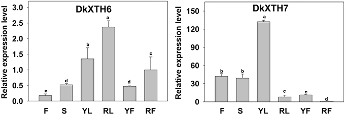 Figure 4. Expression pattern of DkXTH6 and DkXTH7 in various tissues of persimmon fruits. The DkXTH mRNA levels are relative to those of Actin mRNA. “F” and “S” are indicated the flowers and stems picked at anthesis, respectively. Young leaves (“YL”) were picked while rapidly expanding (at ~4 × 6 cm in size), whereas ripe leaves (“RL”) were picked when fully expanded (~10 × 15 cm). Young fruits (“YF”) were picked at 40 days after full bloom, whereas ripe fruits (“RF”) were picked at 150 days after full bloom. Expression of gene at “RF” was used as the control with a nominal value of 1. Vertical bars indicate the standard error of three replicate assays. Columns with different letters at each time point are significantly different (LSD, P = 0.05).